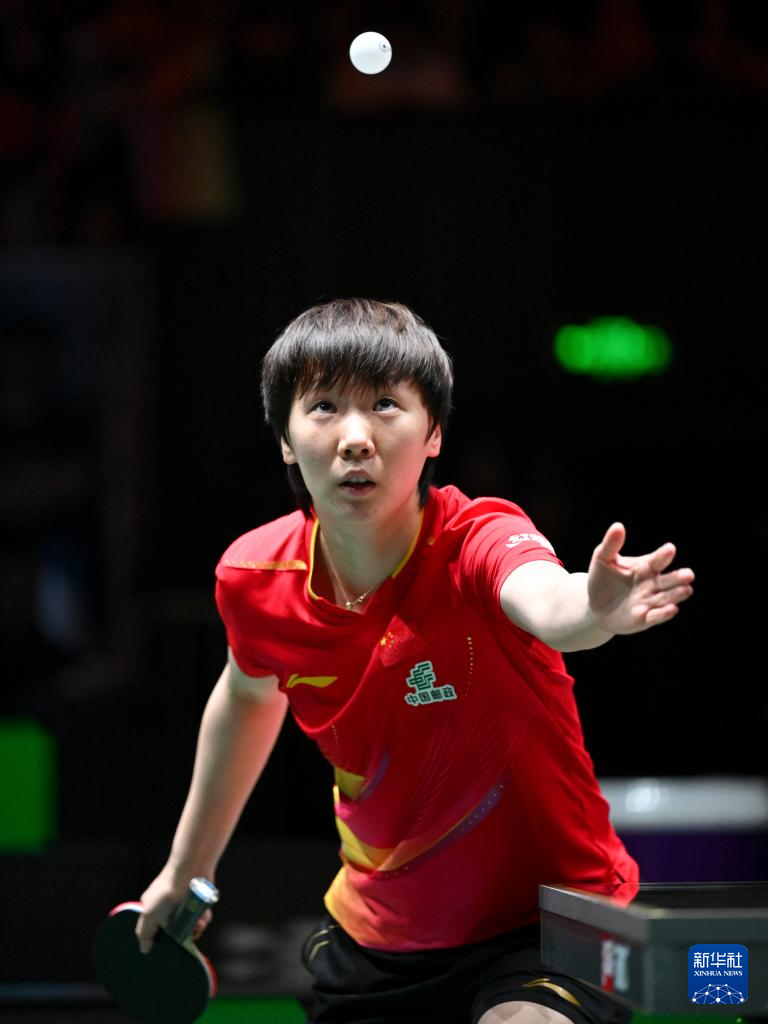 12月2日,中国队选手王曼昱在女单比赛中发球。她3比0战胜智利队选手丹妮拉·奥尔特加。