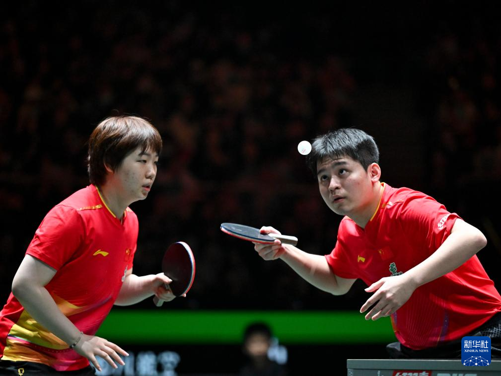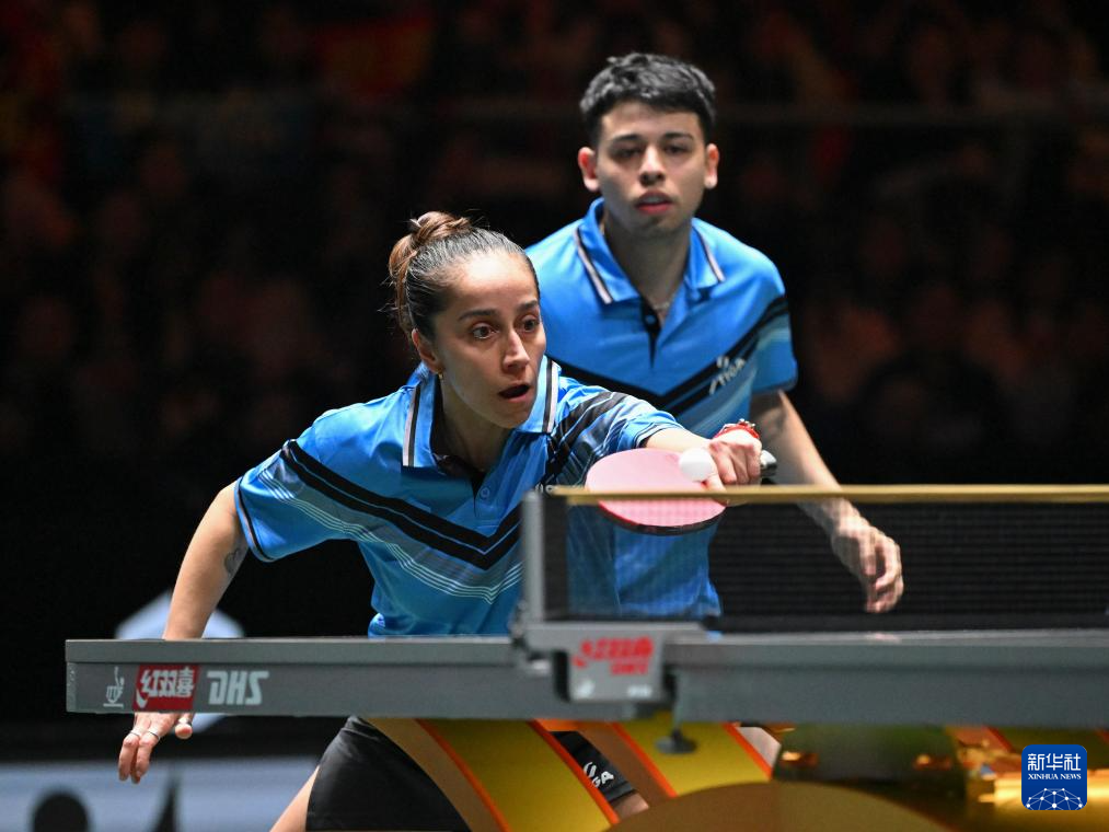 12月2日,中国队组合蒯曼/林诗栋(右)在混双比赛中。他们3比0战胜智利队组合尼古拉斯·博格斯/波琳娜·维加。